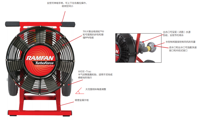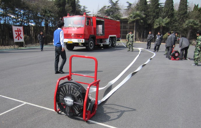 3、WF390水力排烟机采用"力弓"技术,使风量更集中,风力更强大,喷射距离更远,可实现无障碍出入火场通道,并可有效降低使用中产生的噪音实现无障碍沟通。